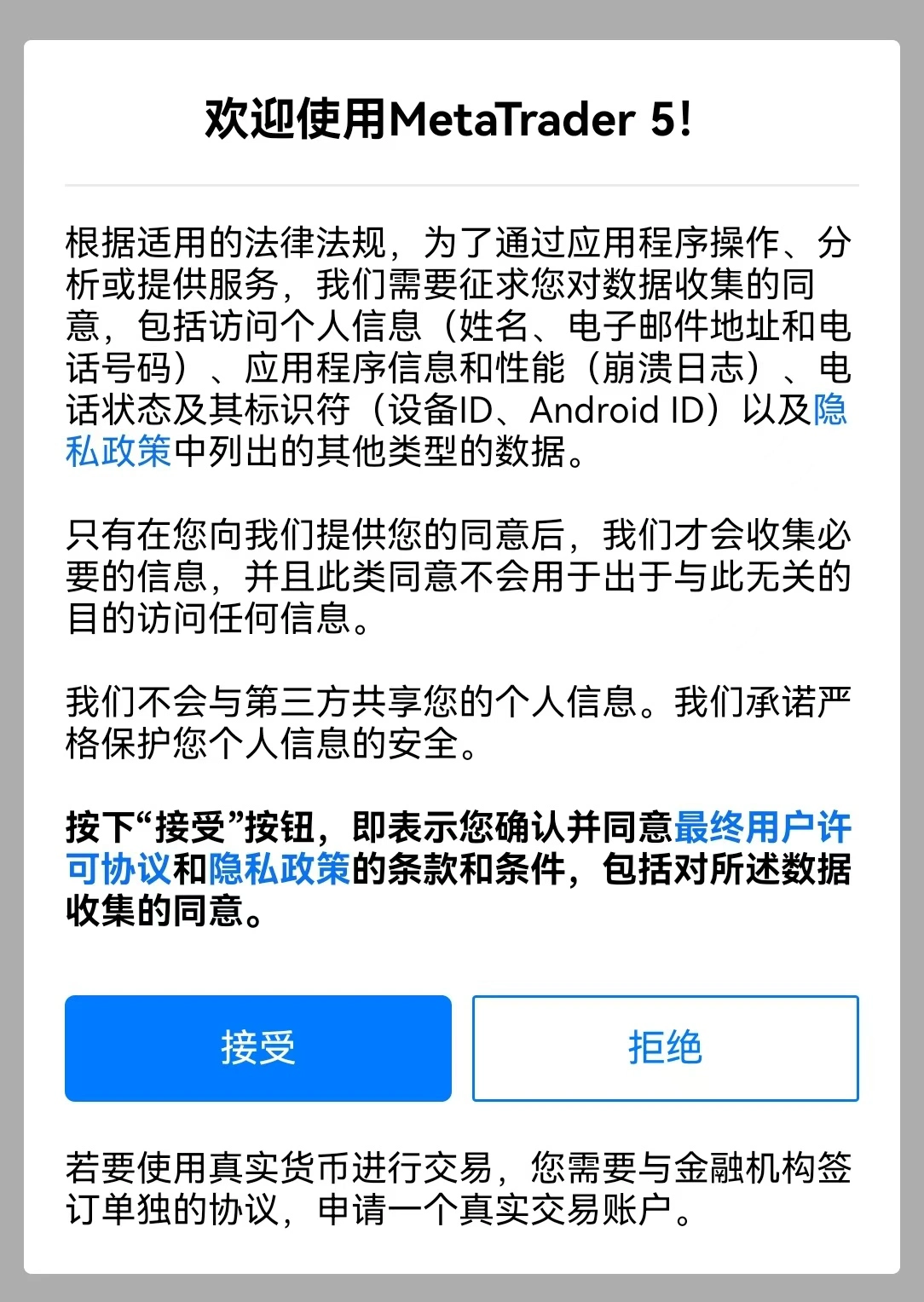 1. 打开MT5应用程序,进入登录界面。如果出现“开设模拟账户”则点击“取消”